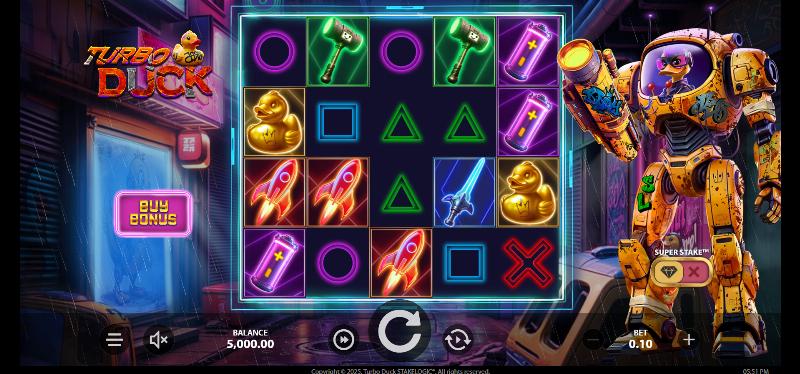 O título Turbo Duck é melhor descrito como um lançamento de volatilidade High lançado pela StakeLogic com RTP avaliado em 95.94% e max win de 6.000x.
