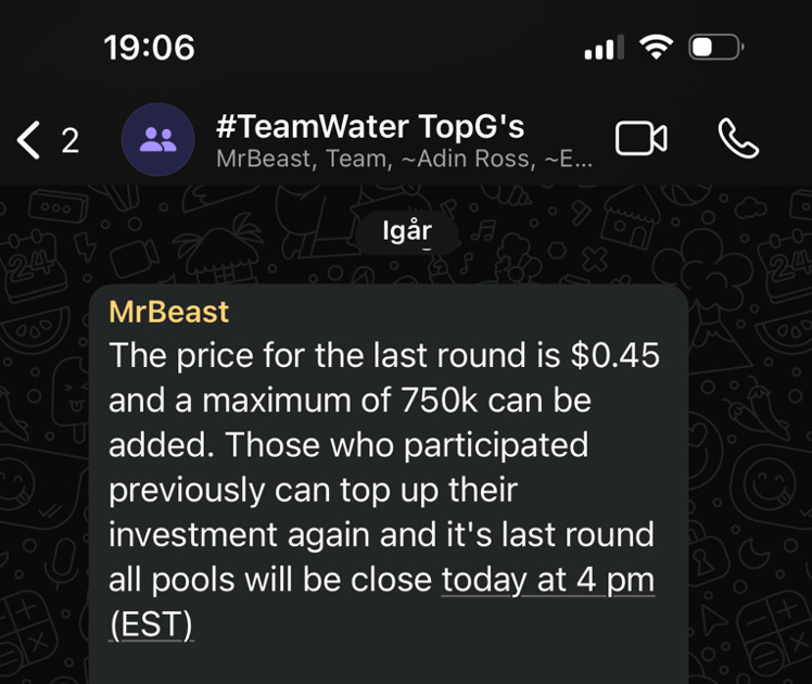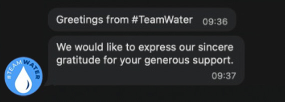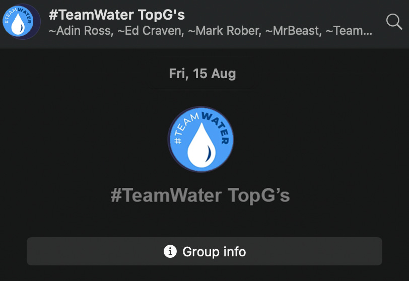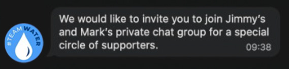 And I’m added to this group called “Team Water TopG’s”, and I’m laughing to myself because it feels like such a “Jimmy” name to put on a chat group with the biggest donors.