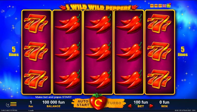 Get started by launching the demo mode located just below. Set up the game for 100 automatic spins and you’ll immediately discover the patterns you should look for and which symbols provide the largest payouts. Play the 5 Wild Wild Peppers demo as much as you need until you feel ready to familiarize yourself with the gameplay and learn about the betting options and other tools.